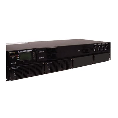 The total system capacity configurations are 2900W to 5800W. The MTS 2U system includes a dual load and battery breaker set-up for bulk feed configuration and 4 additional field configurable load breaker positions.